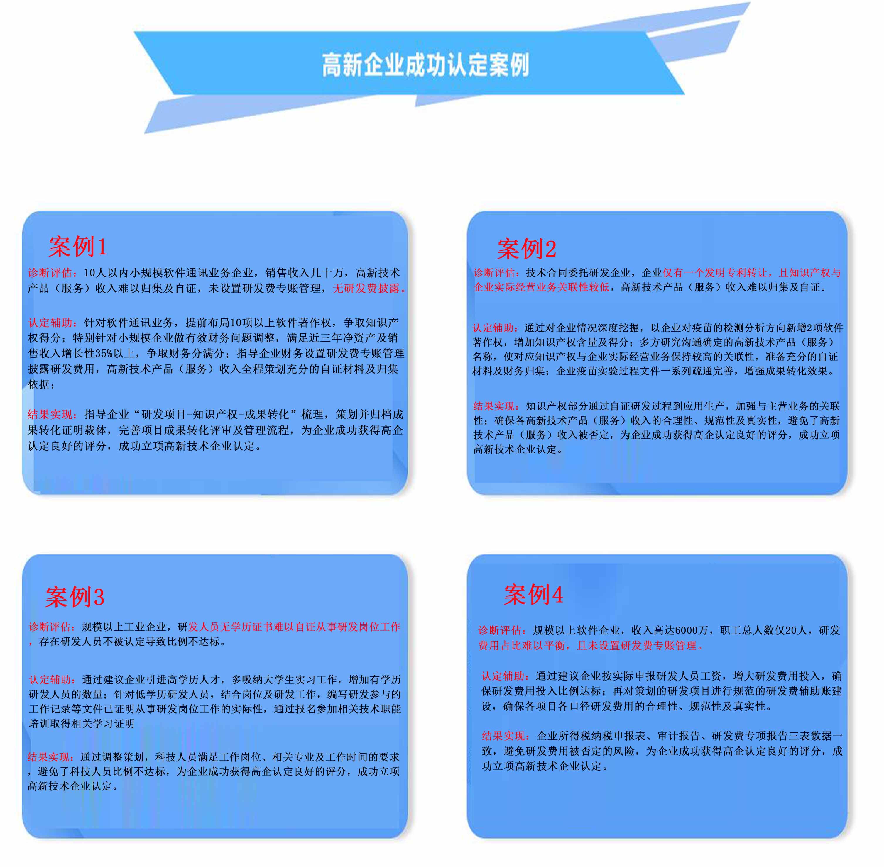 認(rèn)定輔助:針對(duì)軟件通訊業(yè)務(wù),提前布局10項(xiàng)以上軟件著作權(quán),爭(zhēng)取知識(shí)產(chǎn)權(quán)得分;特別針對(duì)小規(guī)模企業(yè)做有效財(cái)務(wù)問(wèn)題調(diào)整,滿(mǎn)足近三年凈資產(chǎn)及銷(xiāo)售收入增長(zhǎng)性35%以上,爭(zhēng)取財(cái)務(wù)分滿(mǎn)分;指導(dǎo)企業(yè)財(cái)務(wù)設(shè)置研發(fā)費(fèi)專(zhuān)賬管理披露研發(fā)費(fèi)用,高新技術(shù)產(chǎn)品(服務(wù))收入全程策劃充分的自證材料及歸集依據(jù);